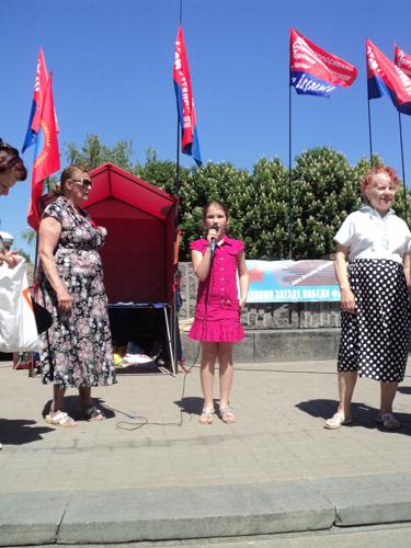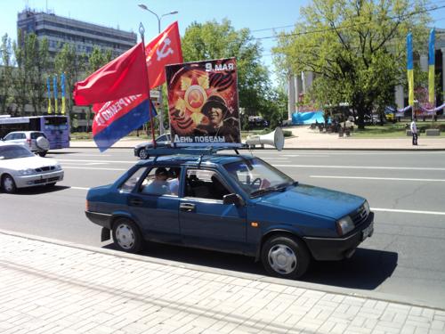 С самого утра Донецкие прогрессисты совершили агитпробег с партийными знамёнами, с поздравительным плакатом, под песни времён Великой Отечественной войны.