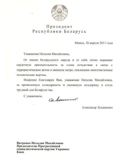 От имени белорусского народа и от себя лично выражаю сердечную признательность за слова сочувствия в связи с террористическим актом в минском метро, повлекшим многочисленные человеческие жертвы.