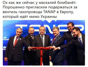 Президент Петр Порошенко продолжает вести героическую борьбу за сохранение Украиной статуса «монопольного транзитера» природного газа в Европу: на всех углах критикуя обходной российский газопровод «Северный поток-2», 12 июня 2018 г. хозяин Банковой принял участие в церемонии запуска обходного Трансанатолийского газопровода (TANAP) из Азербайджана через Грузию и Турцию к границе Болгарии и Греции первоначальной проектной мощностью 16 млрд. куб. м газа в год.