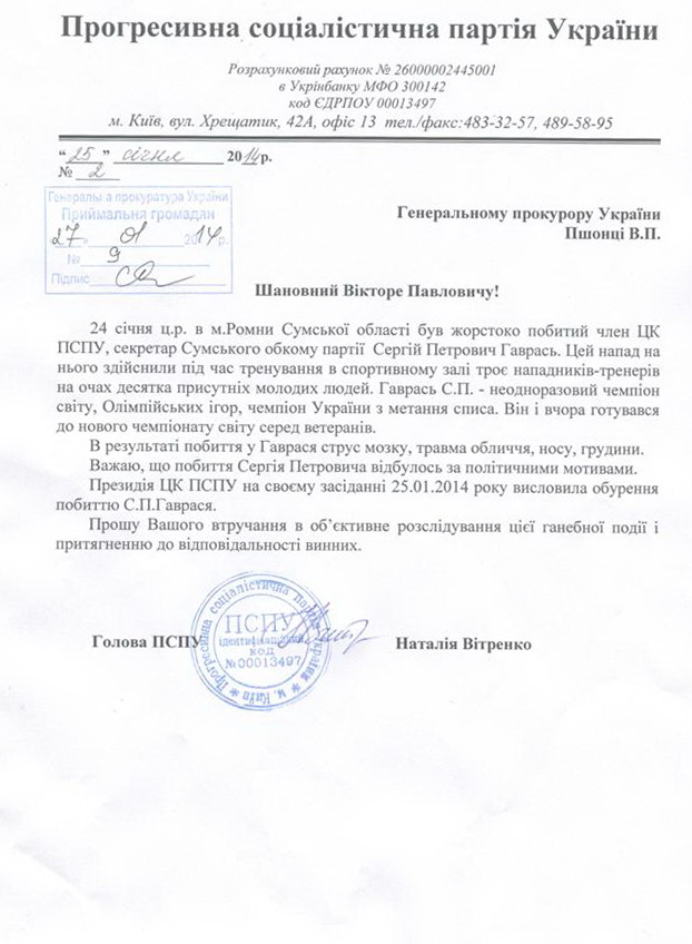 24 января с.г. в г.Ромнах Сумской области был жестоко избит член ЦК ПСПУ, секретарь Сумского обкома партии, мастер спорта международного класса по метанию копья, обладатель Кубка СССР, 36-кратный призер чемпионатов Украины, многократный чемпион мира, Европы и Олимпийских игр среди ветеранов Сергей Петрович Гаврась.