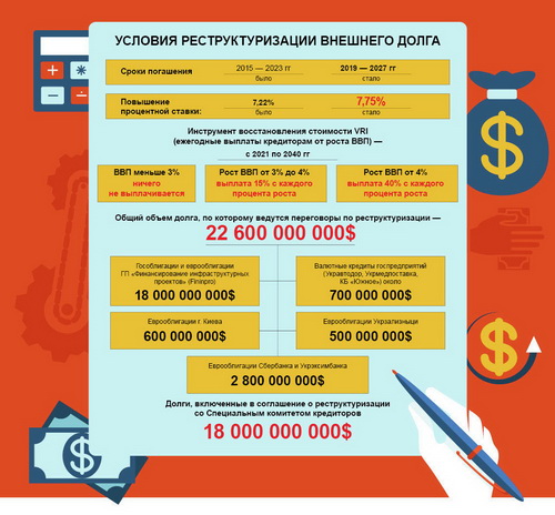 Как пишет агентство Bloomberg, группа кредиторов Украины и владельцев облигаций с наиболее коротким сроком обращения считает невыгодными для себя условия реструктуризации коммерческого долга Украины и требует их пересмотра. REUTERS Philippe Wojazer Владимир Матвеев Группа кредиторов в письме другим держателям таких же ценных бумаг отмечает, что согласованные Министерством финансов Украины и специальным комитетом кредиторов условия предполагают более длительную отсрочку погашения их долгов, чем каких-либо других реструктуризируемых еврооблигаций, пишет Bloomberg. В обмен на списание 20% тела долга и отсрочку погашения облигаций, согласно условиям договоренностей, кредиторы должны получить пакеты специально выпущенных ценных бумаг VRI (Value Recovery Instrument), по которым им при определенных условиях будет выплачиваться компенсация