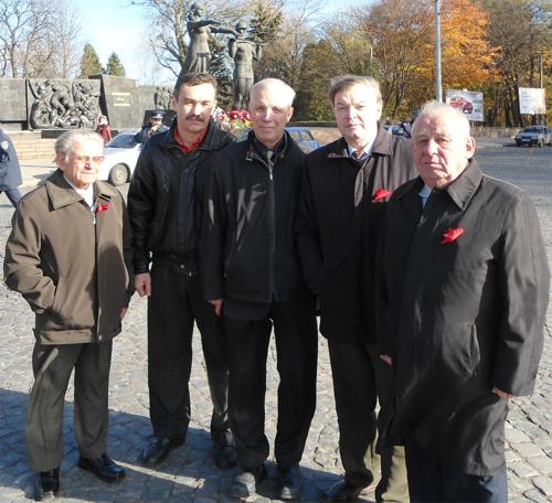 1) керівники осередків Львівських організацій (справа наліво): заступник Голови Львівської обласної організації ветеранів П. Г. Куцин, член ЦК, секретар Львівської міської організації ПСПУ, канд. ек. наук О. С. Покровський, Голова Антифашистського комітету Львівщини О. Н. Калинюк, перший секретар Львівського міського комітету Комуністичної партії України Є. С. Мазур, член Ради Львівської обласної організації ветеранів М. М. Радченко після покладання квітів до Монументу Слави Радянської Армії на честь 95-ї річниці Великого Жовтня, 7.11.2012 р., м. Львів;