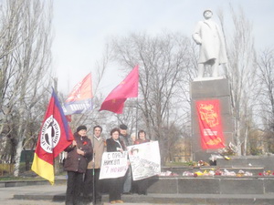 Витренковцы Дзержинска вместе с общественной женской организацией "Дар жизни", профсоюзной организацией КТУ, Новгородской ПСПУ с поздравительными лозунгами пришли к памятнику Ленина, возложили цветы и заявили свой протест "евколонизации"