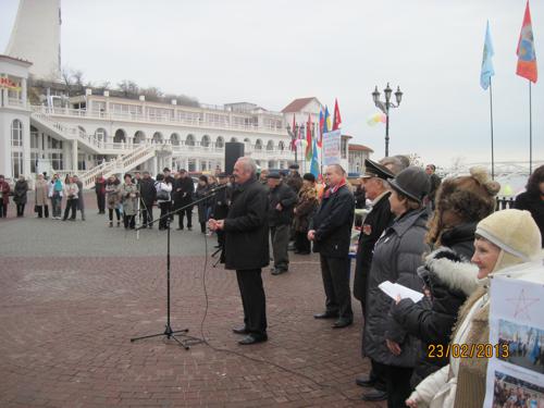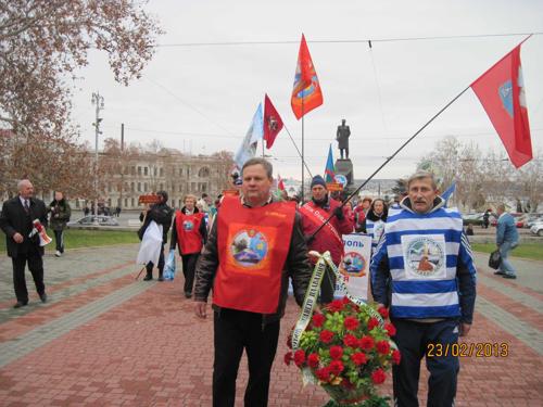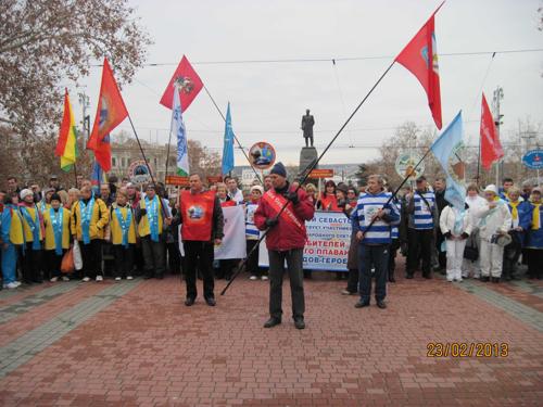 В канун 95-летия создания народной Рабоче-Крестьянской Красной Армии и Военно-Морского флота участники Международного слета возложили цветы к Вечному огню у Мемориала героической обороны Севастополя 1941-1942 гг. 18 команд из России, Беларуси, Украины, Крыма и Севастополя в сопровождении военного оркестра Черноморского флота Российской Федерации прошли по центральным улицам Севастополя от площади Нахимова до пляжа "Хрустальный". Здесь отважных пропагандистов здорового образа жизни с праздником поздравили руководство города, депутаты Севастопольского городского Совета от ПСПУ Евгений Дубовик и Андрей Луненок, севастопольская поэтесса, руководитель ОО "Дети войны Севастополя" Анна Цысарь, инициаторы слета – руководители Севастопольских клубов зимнего плавания "Буревестник" и "Морж СССР" Виктор Пискунов и Алексей Меркулов. Капитаны команд-участников рапортовали о прибытии и готовности к заплыву. Всем командам были вручены памятные подарки и грамоты за пропаганду здорового образа жизни и активное участие в слете. Морской царь Нептун принимал новичков в "моржи", пополнив команды севастопольских клубов еще 10 смелыми пловцами.