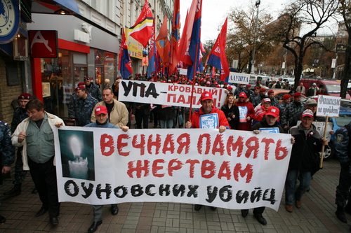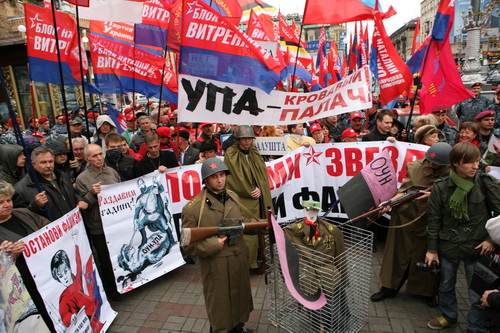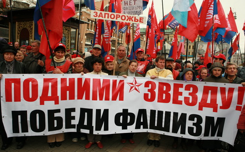 На 14 октября, когда украинские неонацисты под патронатом Ющенко разыгрывают гнусный фарс под названием "свято УПА", Прогрессивная социалистическая партия Украины вместе со своими союзниками - Партией "Киевская Русь" и Всеукраинской профсоюзной организацией "Конфедерация труда Украины" заявила в Киеве мирную, антифашистскую акцию под девизом "Подними звезду! Победи фашизм!".