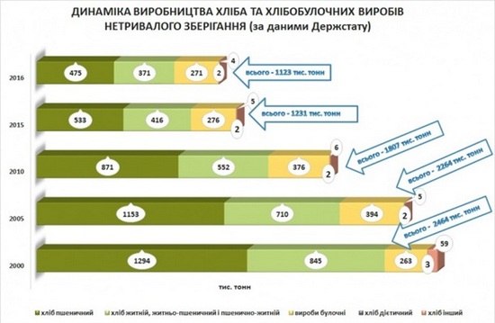 Производство хлеба в Украине с 2000 года сократилось более, чем в два раза - с 2,5 миллионов тонн до 1,1 миллиона. При этом численность населения страны уменьшилась на 14 процентов.