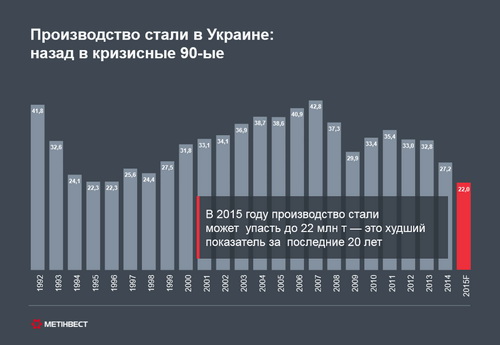 Крупнейший в Украине производитель железорудного сырья – компания "Метинвест" – проанализировал перспективы развития отрасли в текущем году. По данным компании, производство стали по итогам 2015 года может существенно сократиться и достичь наименьшего уровня за все время существования независимой Украины – 22 млн т. При том, что по итогам прошлого года этот показатель составлял 27,2 млн т (см. инфографику).