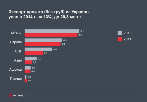 Производство стали в 2015 году может снизиться до рекордно низкого за всю историю независимости Украины уровня – 22 млн т. Причина – прекращение работы металлургических предприятий в Луганской и Донецкой областях из-за военных действий. Эксперты считают такой прогноз нейтрально оптимистическим, поскольку если конфликт распространится на Мариуполь, то производство стали в нынешнем году может снизиться и до 20 млн т. Сопоставимыми темпами будет снижаться и экспорт проката.