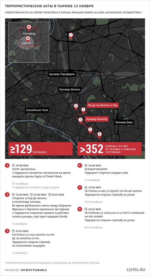 По последним данным, жертвами террористических атак Париже стали как минимум 129 человек, 352 пострадали. Ответственность за теракты взяла на себя запрещенная на территории России террористическая группировка «Исламское государство» (ИГ).