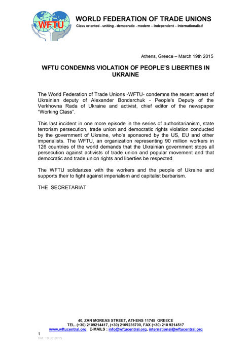 Всемирная Федерация профсоюзов сделала Заявление, в котором осудила арест народного депутата Украины 3-4 созывов, главного редактора газеты "Рабочий класс". ВФП возмущена очередным нарушением свободы слова и прав человека в Украине и требует прекратить преследование рабочего лидера Александра Бондарчука.