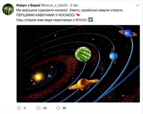Например, есть идея запустить наши кавуны в космос. Гипотетически. Потому что они очень похожи на спутники, которые раньше выводили на околоземную орбиту украинские ракеты. Теперь ракет нет, а кавуны есть. Будем летать на кавунах.
