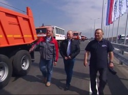 «Поехали!», – сказал после беседы со строителями российский президент, затем лично сел за руль одного из КамАЗов и проехал во главе колонны строительной техники по Крымскому мосту. Всего поездка из Краснодарского края до Керчи заняла 16 минут.