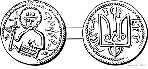 Тризуб же на обороте монеты – не герб (гербов на монетах в то время не было), а изображение-заменитель: в Византии было принято на обороте помещать изображение Христа, Владимир Святославич, ещё не крещёный, заменил его своим личным знаком.
