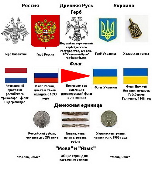 В действительности, как уже было показано, дело обстоит иначе: сплошь и рядом именно в атрибутах государственности и культуры Украины обнаруживаются чуждые русской цивилизации источники (Хазарский Каганат, Золотая Орда, Австро-Венгрия, Польша).