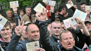 В очереди же говорили о том, что не собираются жить водной стране с "фашистами и бандеровцами". "Мы голосуем за Донецкую народную республику, а потом - за присоединение к России",- заверила "Ъ" Любовь Дроботова из Горловки. "На нашу землю пришли оккупанты. Они готовы вырезать людей, так как понимают, что происходит: начинает восстанавливаться Русь",- добавил Сергей Десятниченко, который прописан в Донбассе, а проживает в Ярославской области.