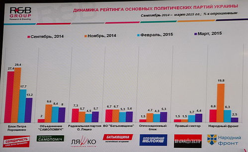 Так, согласно мартовскому опросу компании, если бы выборы в Верховную Раду состоялись сегодня, то "Народный фронт" не преодолел бы пятипроцентный проходной барьер, набрав всего 2,5 процента. Хотя еще в январе – феврале рейтинг этой политической силы превышал 6 процентов, не говоря уже о ноябре прошлого года, когда рейтинг "Народного фронта" составил 19,8 процента.