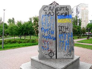 В Киеве вандализировали памятный знак, установленный во времена советской власти в честь установления побратимских отношений между столицами УССР и РСФСР.