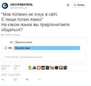 Украинский сайт «Обозреватель», в последние два года превратившийся в рупор государственной русофобии, устроил в Твиттере опрос на тему: «На каком языке вы предпочитаете общаться?».