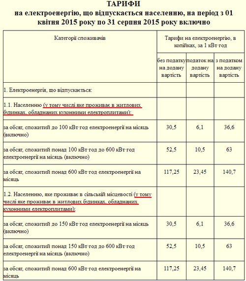 Выдержка из постановления НКРЭКУ "Об установлении тарифов на электроэнергию, отпускаемую населению"