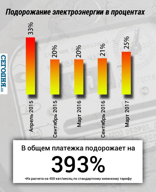 В целом повышение тарифов на "свет" пройдет в 5 этапов, начиная с 1 апреля 2015 года, и завершится к 1 марта 2017 года. , в частности, вырастут с 1 апреля 2015 года, с 1 сентября 2015 года, с 1 марта 2016 года, с 1 сентября 2016 года и с 1 марта 2017 года.
