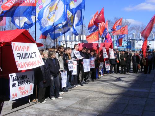 Уже к девяти часам утра перед зданием на площади развевались флаги ПСПУ, были установлены агитационные палатки и развернуты плакаты в поддержку Дмитрия Табачника и против фашизма.