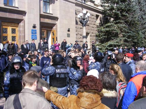 Однако, узнав об этом, ведущая митинг депутат облсовета от Блока Наталии Витренко Лариса Шеслер призвала всех митингующих немедленно дать отпор зарвавшимся тягнибоковцам, и основная часть митингующих тут же направилась к зданию горсовета.
