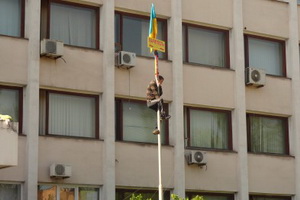 Только что с флагштока возле городского совета был сброшен флаг Украины, который сегодня утром в 8.30 водрузили сторонники единой Украины.