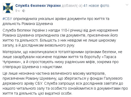 "Материалы, которые накапливались тоталитарными органами безопасности, не только запечатлели насыщенную событиями жизнь и борьбу "Тараса Чупринки", но и опровергают ряд советских мифов, в частности о сотрудничестве Шухевича с нацистами", - говорится в сообщении СБУ в Facebook.
