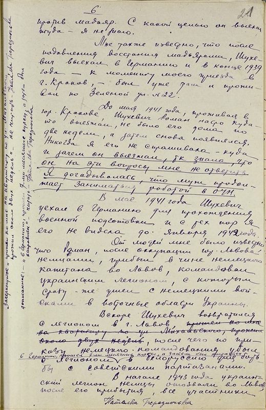 "В мае 1941 года Шухевич уехал в Германию для прохождения военной подготовки и с тех пор я его не видела... От людей мне было известно что Роман после оккупации Львова немцами, в чине немецкого капитана во Львов, командовал украинским легионам, с которыми сразу же ушел с немецкими войсками в восточные области Украины. Вскоре Шухевич возвратился с легионов во Львов, после чего по приказу немецкого командования убыл в Белоруссию для борьбы с советскими партианами", - рассказала его жена.