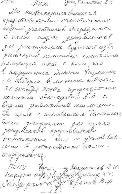 29 вересня 2010 року, брутально порушуючи Закон України "Про вибори депутатів Верховної Ради Автономної Республіки Крим, місцевих рад та сільських, селищних, міських голів", Вами проведено прийом документів від представників Партії регіонів, КПУ, Народна партія, Батьківщина поза чергою, чим порушено відносно нас, а також представників інших політичних партій вимоги частини 7, статті 66 зазначеного закону. Крім цього дана обставина має наявні ознаки корупційного діяння, у зв"язку з чим складено акт від 29.09. 2010 р. (до заяви додається).