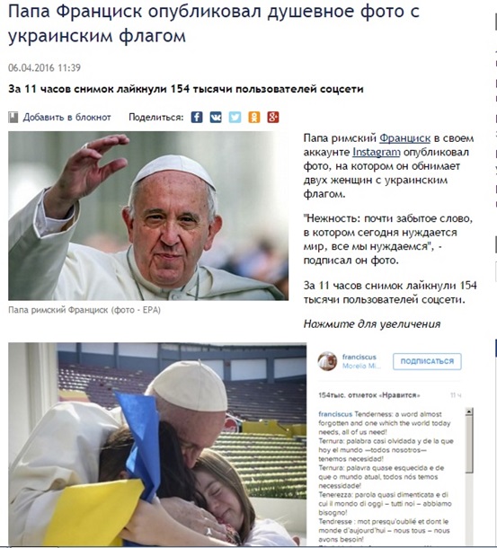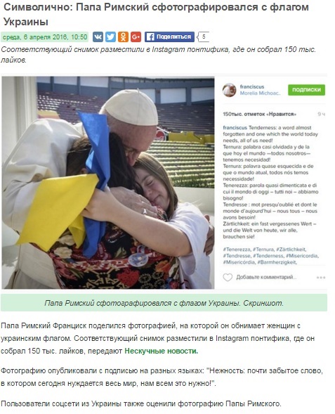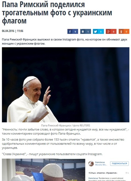 Ряд украинских СМИ сегодня распространили информацию, что Папа римский Франциск в своем аккаунте Instagram опубликовал фото, на котором он обнимает двух женщин с украинским флагом.