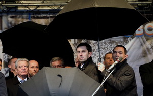 Во время протеста в президента Чехии полетело несколько яиц, которые, тем не менее, не достигнув цели, случайно попали в немецкого главу государства.
