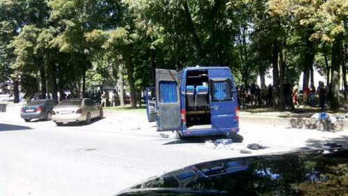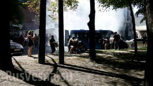 Кроме того, молодчики в балаклавах разбили микроавтобус, который был припаркован возле офиса и подожгли его. Предварительно, в нем передвигалась охрана нардепа Михаила Добкина.