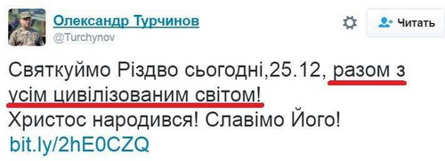 «Празднуем Рождество сегодня, 25 декабря, вместе со всем цивилизованным миром», – написал в соцсети Турчинов.