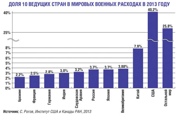 Доля США в мировых расходах на оборону составляет 37 процентов. При помощи глобальной сети военных баз, информационного мониторинга, электронной разведки они пытаются удерживать контроль над всем миром, пресекая попытки отдельных стран вырваться из долларовой зависимости.