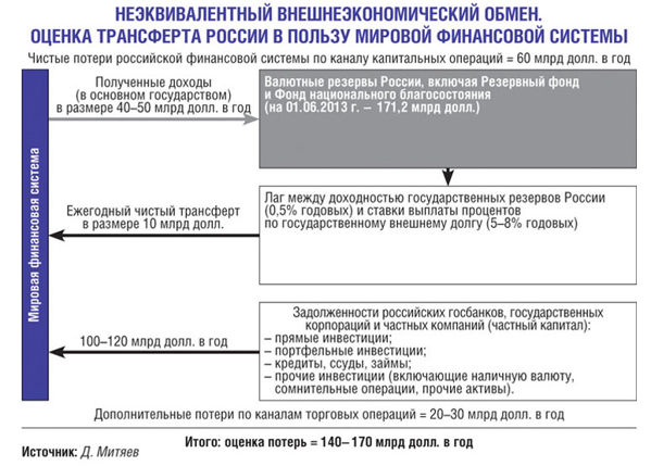 В том числе, порядка 60 миллиардов долларов уходит из страны в форме сальдо по доходам от иностранных кредитов и инвестиций, около 50 миллиардов составляет утечка капитала. Накопленный объем последней достиг 0,5 триллиона долларов, что в сумме с прямыми иностранными инвестициями (ПИИ) российских резидентов составляет около триллиона долларов вывезенного капитала.