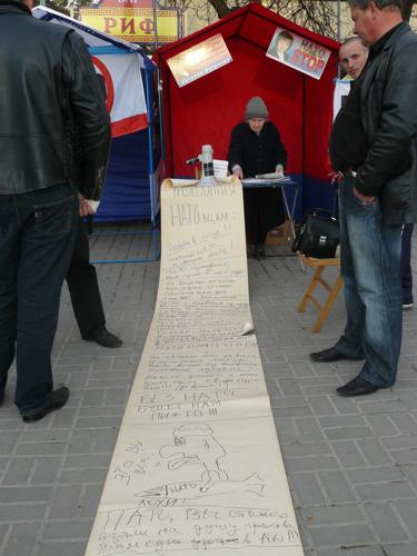 Витренковцы блокируют центральный выезд из порта, где стоит фрегат, своим информационным палаточным городком. На 10-ти метровом рулоне бумаги севастопольцы оставляют свои "пожелания" НАТОвцам как в стихах, так и в прозе.