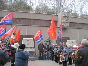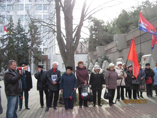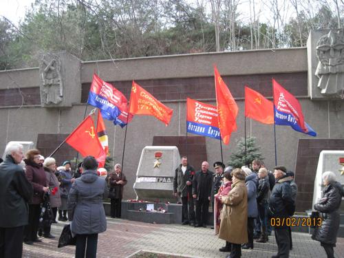 В Севастополе на Аллее городов-героев состоялся митинг, посвященный 70-летию Сталинградской битвы. Активисты Прогрессивной социалистической партии Украины, Союзного движения "17 МАРТА", Партии "Киевская Русь", общественных организаций "Дети войны Севастополя", "Дар жизни", "Жители осажденного Севастополя", "Суть времени" и Дома ветеранов собрались возле стелы города-героя Волгограда, чтобы почтить память героев Сталинграда – защитников нашей Великой Родины. Севастопольская поэтесса Анна Цысарь читала патриотические стихи о Сталинграде, о подвиге советского народа.