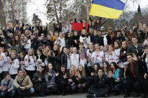 Подобная же политика осуществляется партией власти (ПР) и в Крыму. Во времена Ющенко в Симферопольской украинской гимназии демонстрировали фильмы про главнокомандующего УПА Р. Шухевича [2], срывали советские ордена со стелы "Артека" [3], в Ялте под одобрительные возгласы съехавшейся со всей округи "свидомитской" братии установили бандеровско-диаспорянский памятник Шевченко, абсолютно не похожий на оригинал [4]. Всё чаще для организации провокаций в Крыму стали использоваться студенты. Не так давно представителями "студенческого б-ства" не без помощи спецслужб организовывались провокации вокруг маяков Черноморского флота РФ. В Ялте т.н. "студенческий парламент" несколько лет подряд при поддержке местных "регионалов" устраивает 22 января (на т.н. день "соборности") флешмоб в вышиванках, в ходе которого "студенты", никого не стесняясь, поднимают бандеровский флаг и вскидывают руку в нацистском приветствии (зигуют). [5]