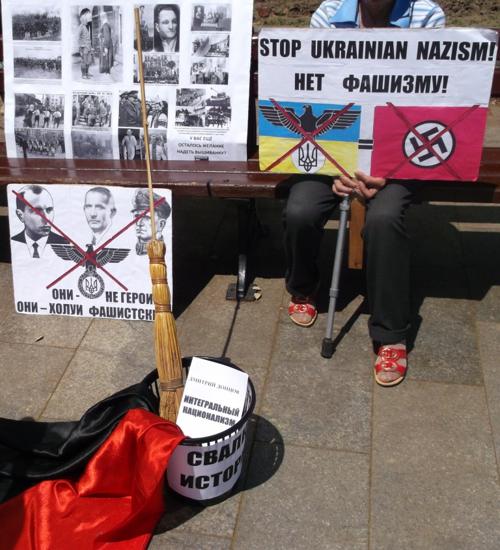 Ялтинские антифашисты развернули стенды, на которых изобразили шароварно-вышиваночную историю украинских националистов, всё время своего существования прислуживающих врагам России. В ходе митинга выступили: депутат ЯГС Александр Коробейников, помощник депутата Владимир Лазович, член АФК Ялты Игорь Лутков, была заслушана информация о сегодняшнем положении дел в антифашистском движении Украины и Ялты, была осуждена двуличная позиция партии власти, которая вместо реальной борьбы, занимается её профанацией. Резолюция митинга была поддержана единогласно. По окончании митинга были устроены торжественные "похороны" на "свалке истории" идей Донцова, Бандеры и Шухевича.