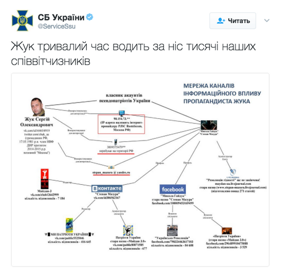 По данным СБУ, этот человек непосредственно причастен к созданию и администрированию с территории РФ групп в социальных сетях, которые называются "Патриоты Украины", "Украинская революция", "Все на Майдан", "Продолжение Революции достоинства", "Майдан-3", "Мы – патриоты Украины".