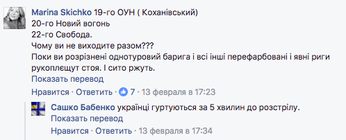 "Прошло три года с кровавых событий Революции Достоинства. Тогда мы объединились ради одной цели - свержение режима олигархата в Украине и рождения настоящей украинской независимости. Но опять циничный режим внутренней оккупации захватил власть в Украине и царит в крови нашего народа. И сегодня как никогда актуален вопрос: так кто кого? Итак, 19 февраля 14:00 Майдан Независимости. Вече с участием активистов Блокады торговли в крови, которое продлится маршем памяти и перформансом. Приди и возьми будущее страны в свои руки. Вместе победим!" - отмечается в заявлении Добровольческого Движения ОУН