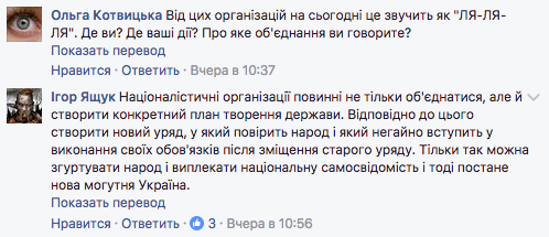 Организаторы одного из вышеупомянутых сообществ - "Украинская революция", комментируя по просьбе "Страны" обвинения в свой адрес, сообщили, что агентами Кремля они, наоборот, считают тех, кто противостоит их акции. "Мы - агенты Кремля? Разве этот режим - не меньшее из возможных зол для Кремля? В случае национально-освободительной Революции разве не придут к власти те, кого Кремль меньше всех хотел бы видеть во главе Украины?" - заявили в сообществе.