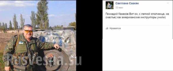 Шокирующим кадром поделилась с собеседником в Facebook его жена - Светлана Саакян, сопроводив фотографию комментарием: «Вот он, с лапкой ополченца, на счастье) как американские инструкторы учили)».