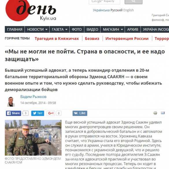 В Сети появилось фото известного днепропетровского адвоката, боевика «АТО» Эдмонда Саакяна, в традициях ИГИЛ* с удовольствием позирующего на фоне автомобиля, к «запаске» которого прикреплена отрубленная рука ополченца.