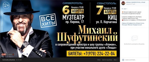 Также приводится афиша выступлений Шуфутинского в Крыму.
