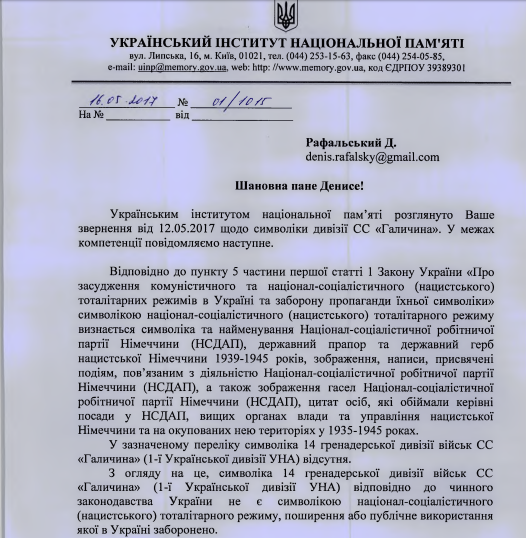 "Страна" получила официальный ответ из Института национальной памяти, возглавляемого Владимиром Вятровичем, по поводу символики дивизии СС "Галичина".