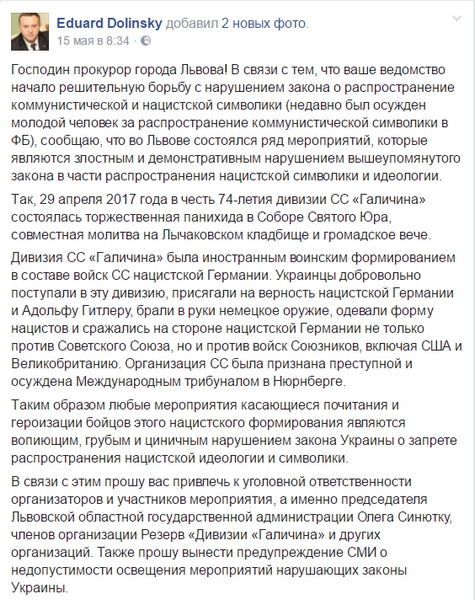"Господин прокурор города Львова! - написал Долинский на своей странице в ФБ. - В связи с тем, что ваше ведомство начало решительную борьбу с нарушением закона о распространении коммунистической и нацистской символики (недавно был осужден молодой человек за распространение коммунистической символики в ФБ), сообщаю, что во Львове состоялся ряд мероприятий, которые являются злостным и демонстративным нарушением вышеупомянутого закона в части распространения нацистской символики и идеологии.