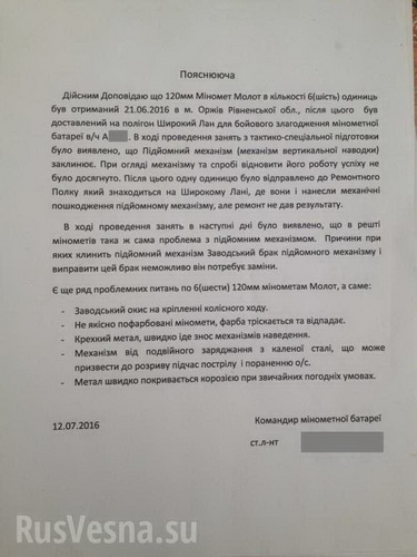 Для начала, выяснилось, сколько именно стоили миномёты ?Молот" украинским налогоплательщикам - 483 512 гривен за единицу. Однако дальше всё ещё интереснее - была опубликована объяснительная записка командира миномётной батареи, в которой он перечисляет многочисленные недостатки, недоделки и брак новых миномётов. Наименьшей проблемой является облезающая краска.