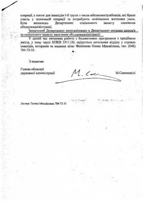 Председатель фракции отмечает, что еще в прошлом году правительство выделило из госбюджета почти 1,5 млн гривен для приобретения квартир одесским инвалидам «АТО». В итоге была куплена лишь одна квартира по цене примерно 500 тысяч гривен.